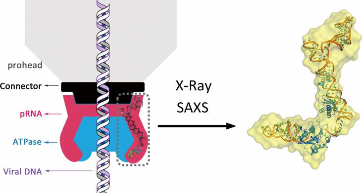 双链DNA病毒(如乙肝、天花、乳头瘤和疱疹等)严重危害人类健康,而对其感染的诊断和治疗至今仍是当今生物医学界的难点。双链DNA病毒的成熟与增殖依赖于其基因组的包装,而这一基因组的包装机制目前尚不明确。由于构象复杂、组分多、缺乏对称性等原因,目前尚未有双链DNA病毒基因组包装马达(pRNA)末端的结构报道,同时对于其和ATPase(gp16)相互作用情况以及包装过程中所发生的构象变化了解甚微,严重阻碍了对病毒包装原理的进一步了解。陆昌瑞教授研究团队针对以上难点开展了相关研究,通过晶体衍射、小角散射技术(SAXS)并结合SHAPE化学探测法首次全面解析出核酸与蛋白复合物的结构和构象信息。